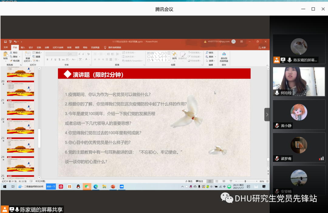 为深入学习四史知识,于学思践悟中坚定理想信念、于奋发有为中践行初心使命,营造“知史爱党、知史爱国”的良好氛围,美高梅MGM电子娱乐游戏20硕团支部于1月17日举办学习“强”国,抗“疫”到底四史知识线上知识竞赛。支部成员积极响应,精心准备,呈现了一场精彩的四史知识竞赛。