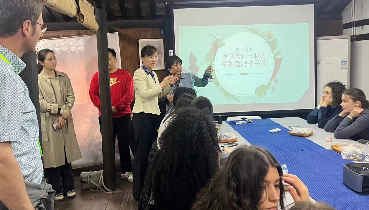 展示馆古色古香,松江棉布及制品陈列其中,沉静秀美。恰逢卢森堡高中生一行在校长带领下前来参观体验中国非遗文化,张曦为其担任了现场口译工作,杨潘红馆长介绍了松江布的历史,阐释了回字纹福寿延绵、生生不息的内涵,品牌标志“鲲”蕴含的博大精深的庄子哲学,端午挂香囊的风俗与寓意等,通过语言恰如其分的转换,厚重的纺织文化得以传播,其中的故事娓娓道来,外国友人为布艺品背后深厚的历史文化深深折服。